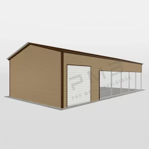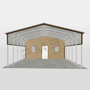 Width varies based on how many vehicles you want to shelter under the front canopy and how much room you want to move around doors and equipment. Your exact dimensions are customized to your property and your routine, and our team can help you choose a size that makes sense for your vehicles and storage plans.